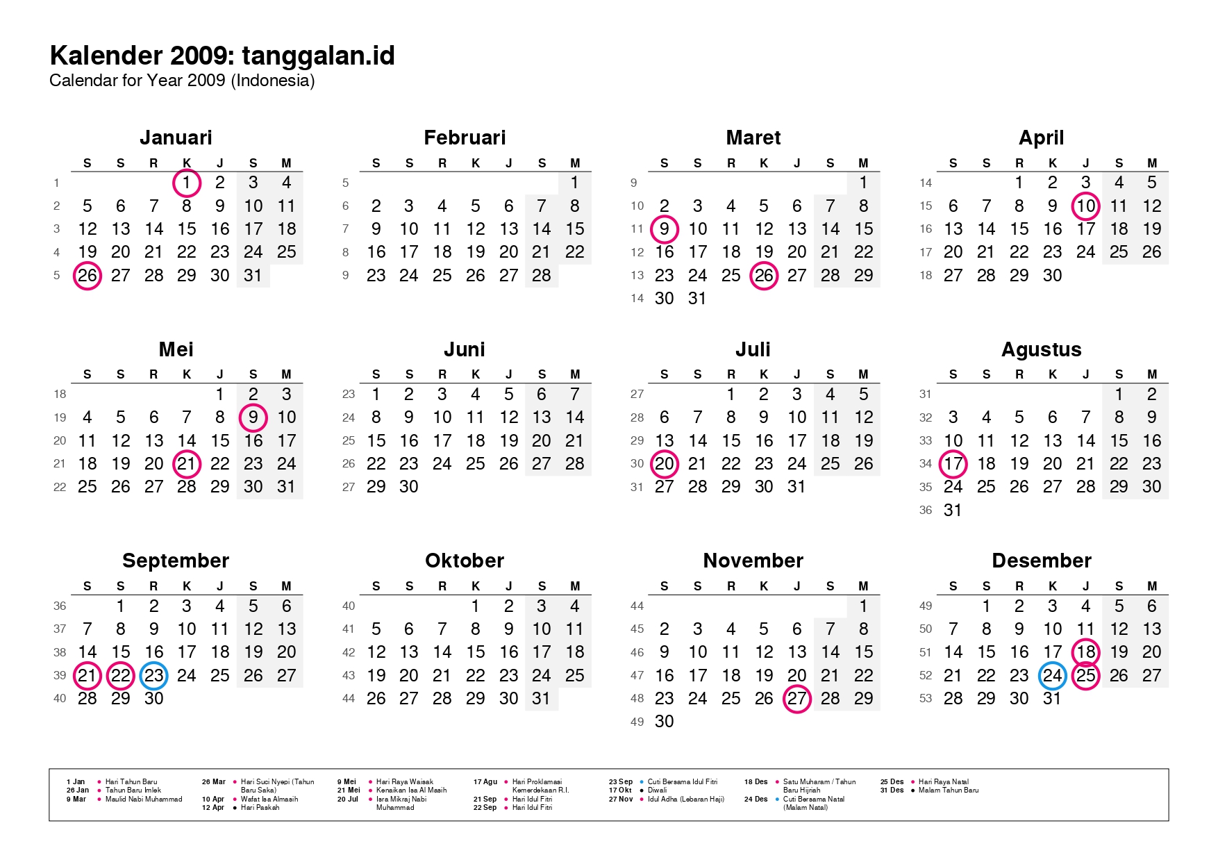 Kalender Indonesia tahun 2009 lengkap dengan hari libur nasional, tanggal merah, dan cuti bersama.