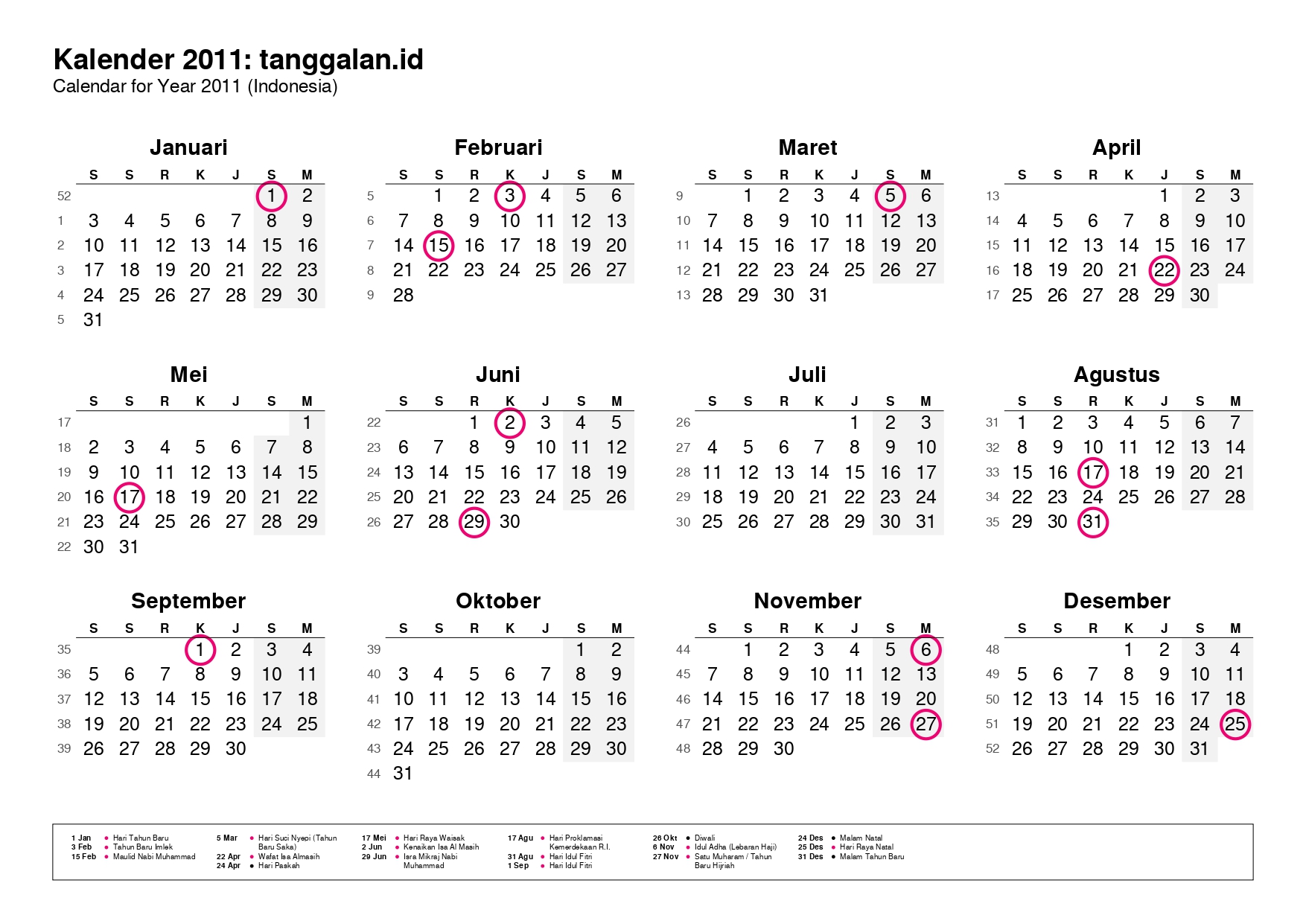 Kalender Indonesia tahun 2011 lengkap dengan hari libur nasional, tanggal merah, dan cuti bersama.