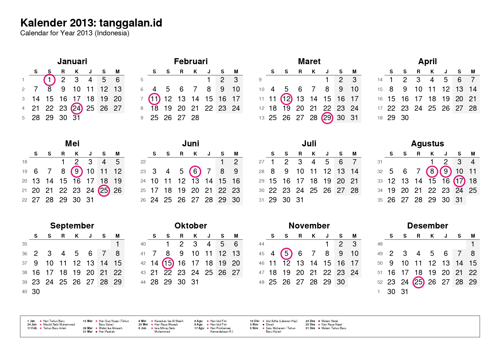 Kalender Indonesia tahun 2013 lengkap dengan hari libur nasional, tanggal merah, dan cuti bersama.