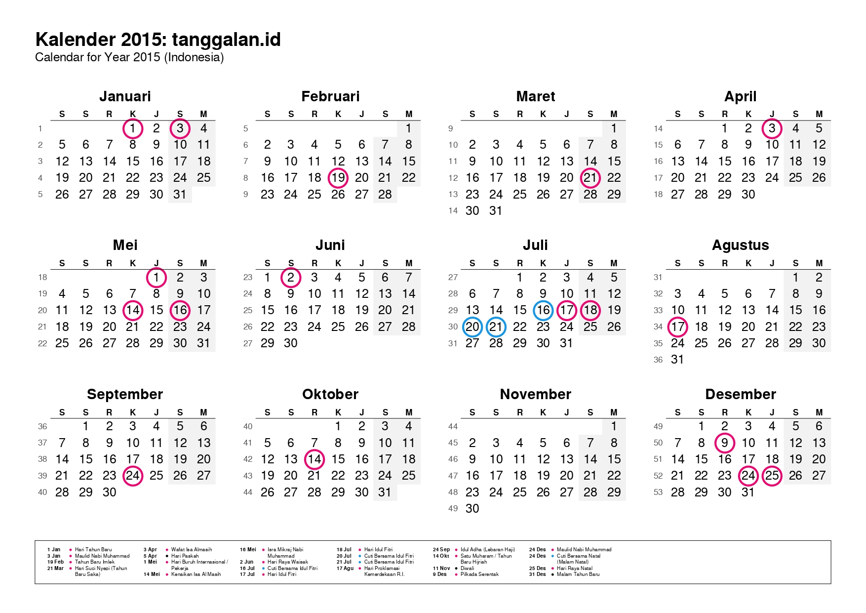 Kalender Indonesia tahun 2015 lengkap dengan hari libur nasional, tanggal merah, dan cuti bersama.