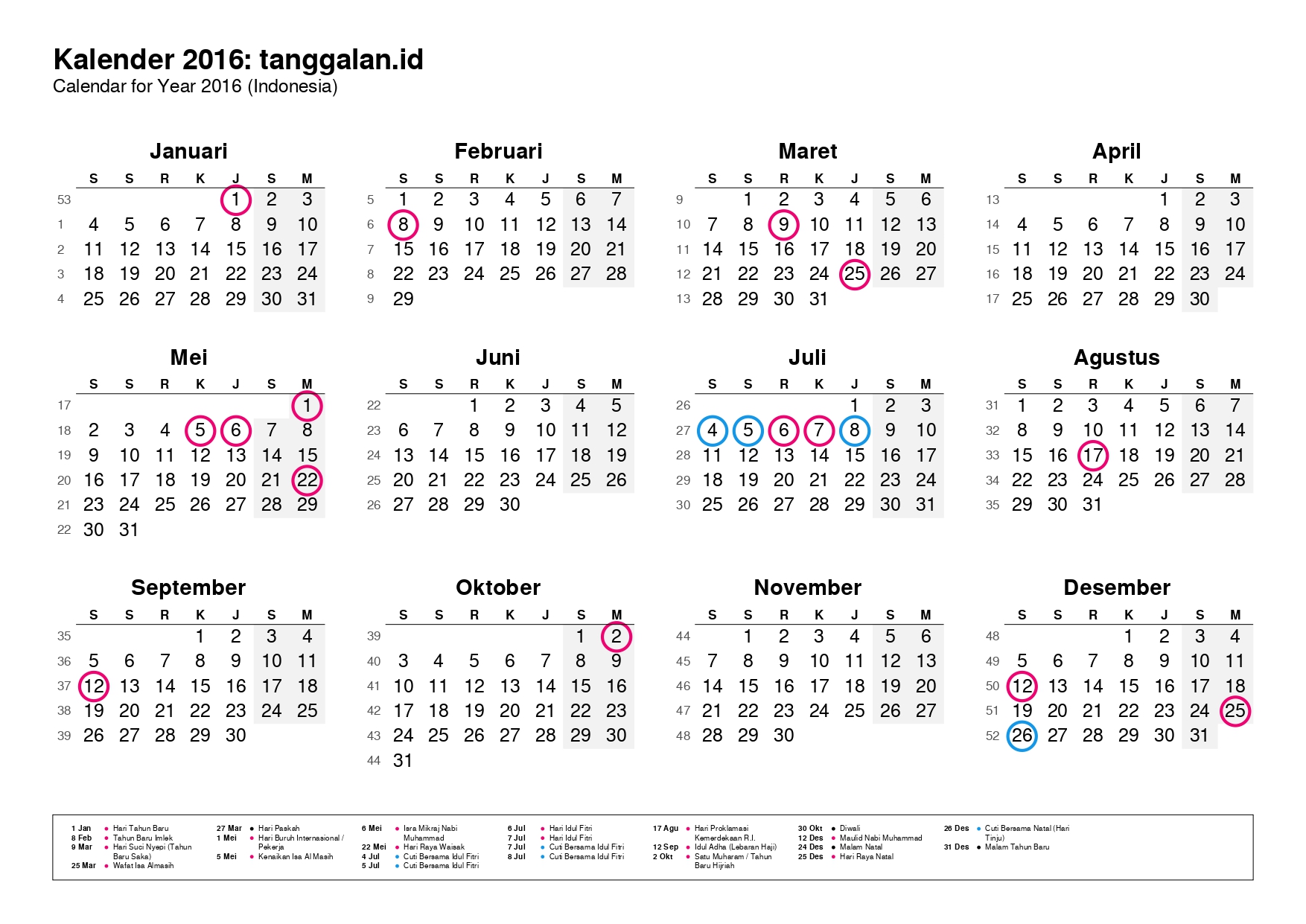 Kalender Indonesia tahun 2016 lengkap dengan hari libur nasional, tanggal merah, dan cuti bersama.