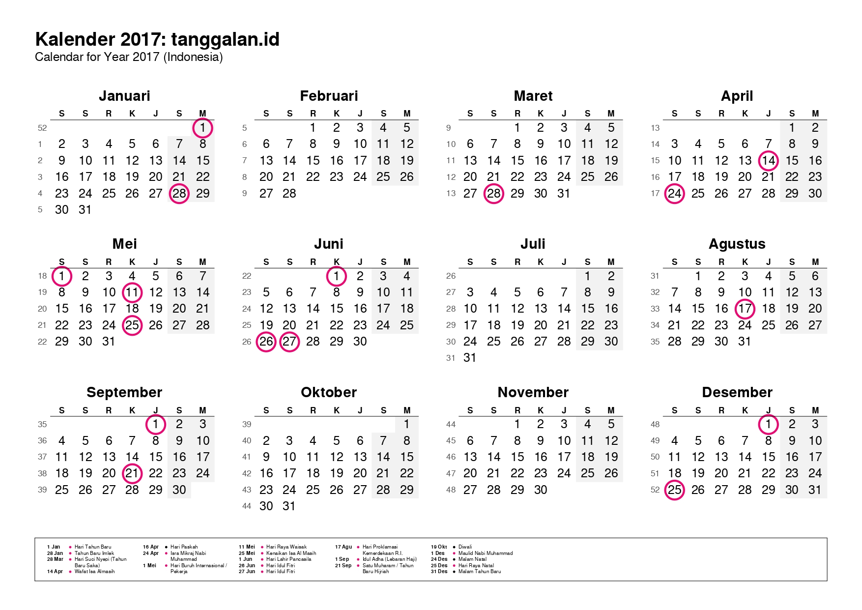 Kalender Indonesia tahun 2017 lengkap dengan hari libur nasional, tanggal merah, dan cuti bersama.