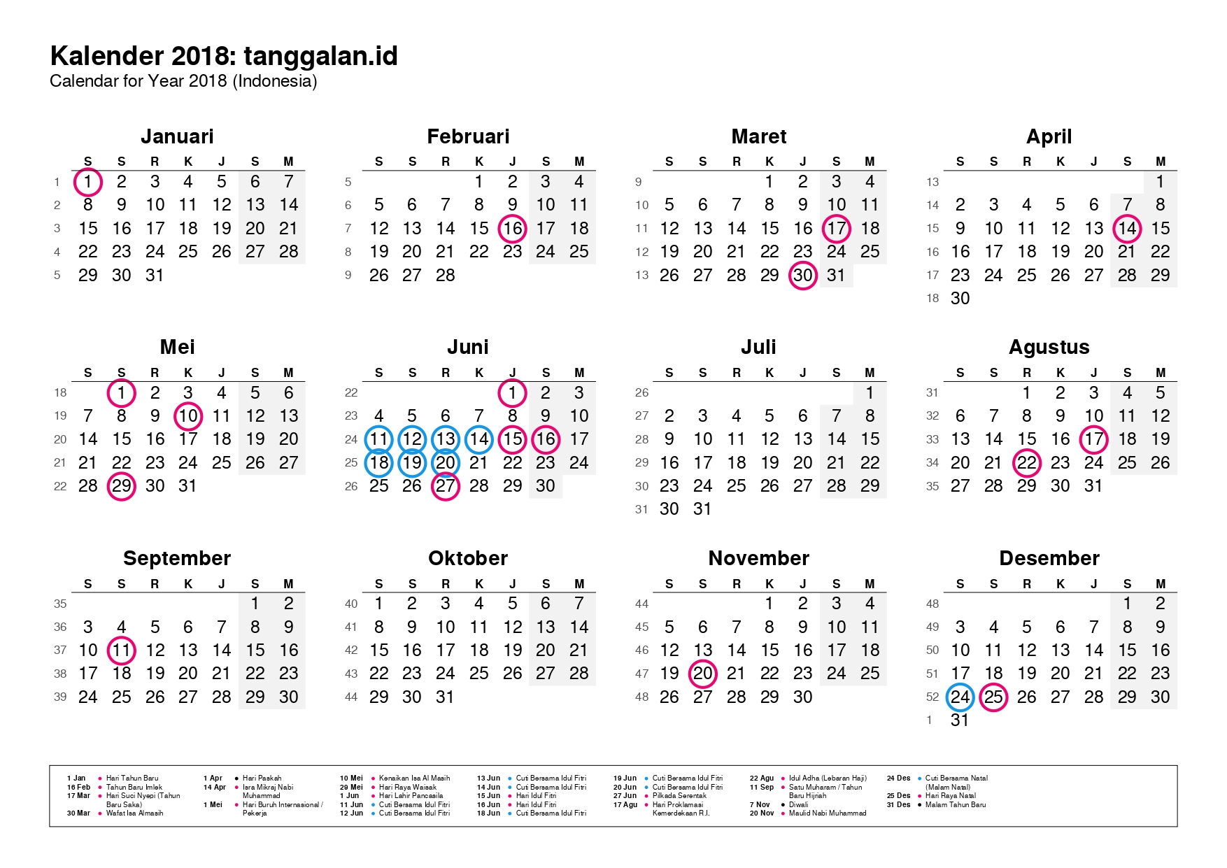 Kalender Indonesia tahun 2018 lengkap dengan hari libur nasional, tanggal merah, dan cuti bersama.