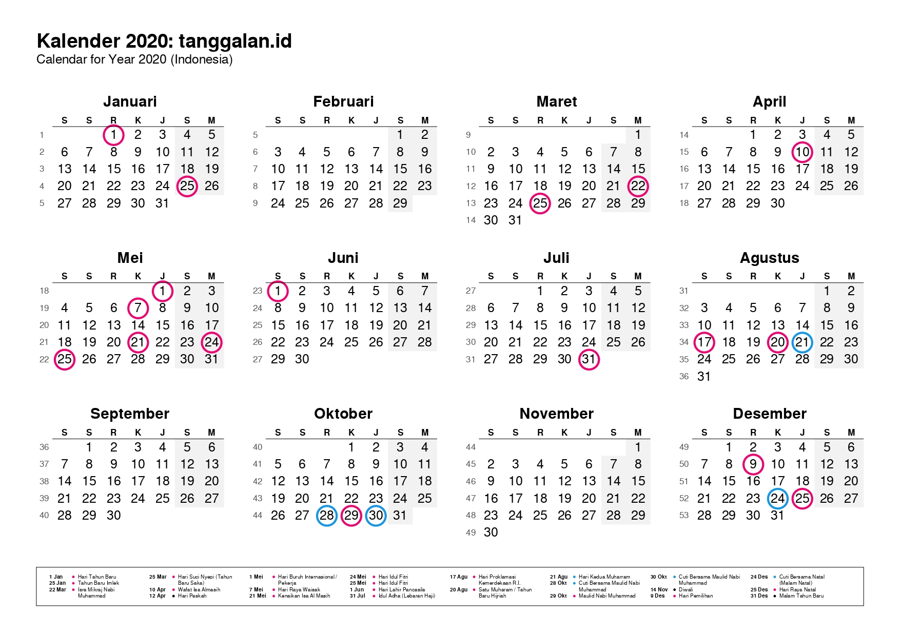 Kalender Indonesia tahun 2020 lengkap dengan hari libur nasional, tanggal merah, dan cuti bersama.