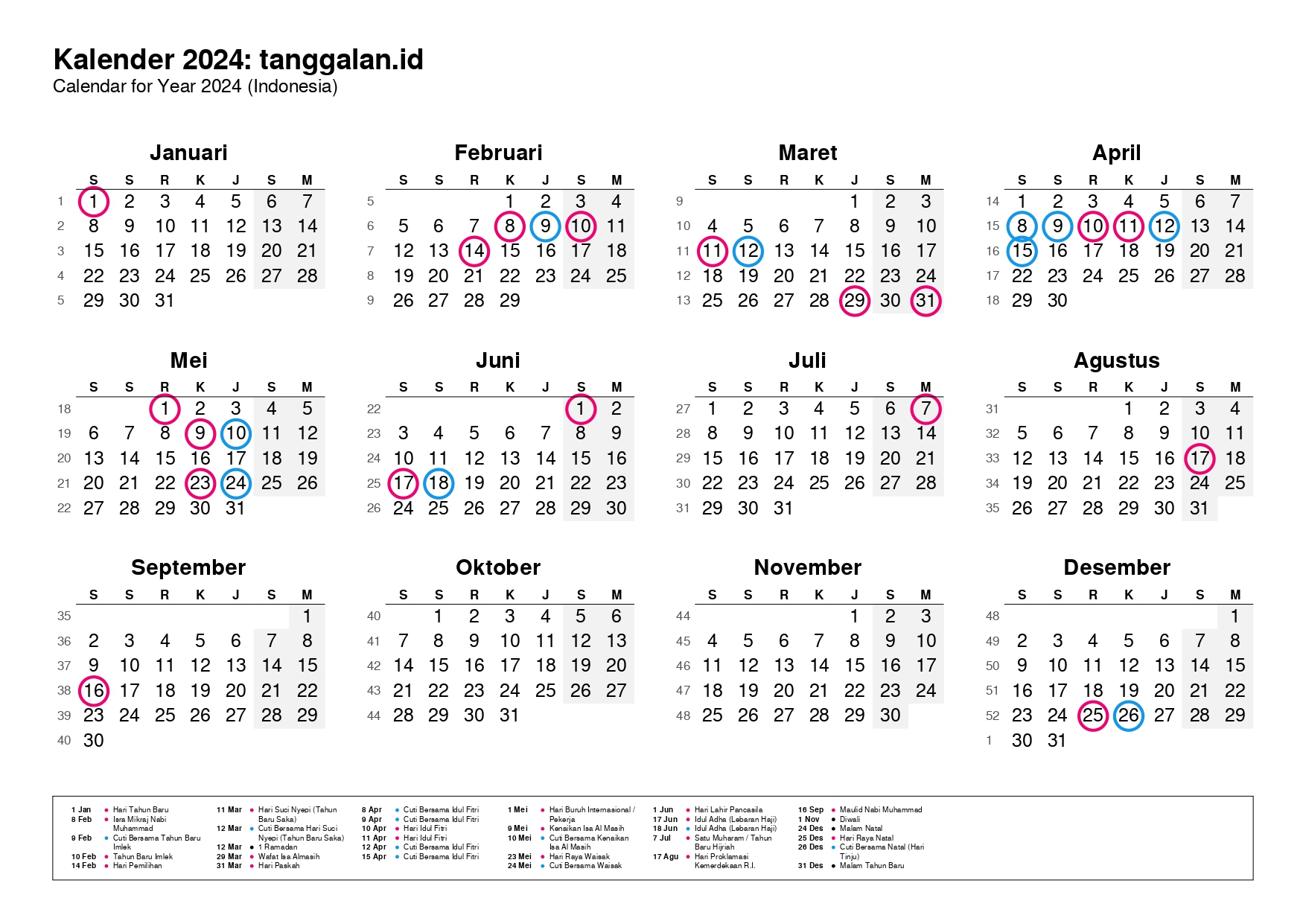 Kalender Indonesia tahun 2024 lengkap dengan hari libur nasional, tanggal merah, dan cuti bersama.
