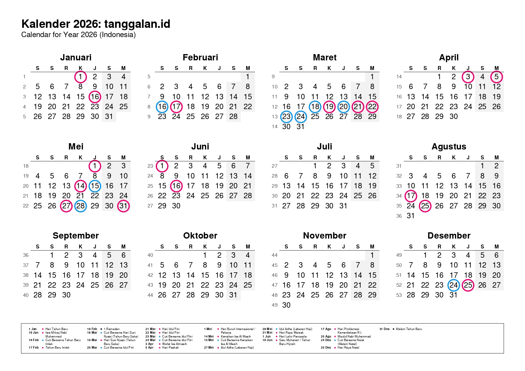 Kalender Indonesia tahun 2026 lengkap dengan hari libur nasional, tanggal merah, dan cuti bersama.