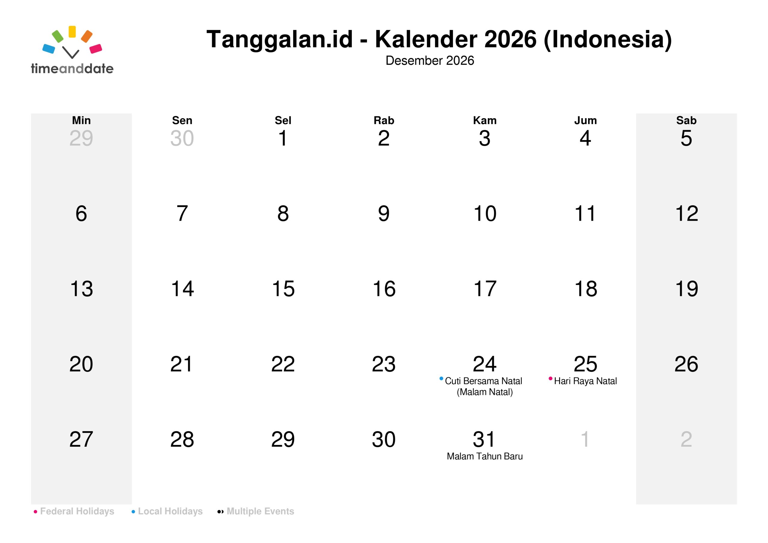 Kalender Desember 2026 ini berisi daftar lengkap hari libur nasional dan cuti bersama. Simak tanggal merah Desember 2026 untuk perencanaan kerja, sekolah, dan liburan keluarga.