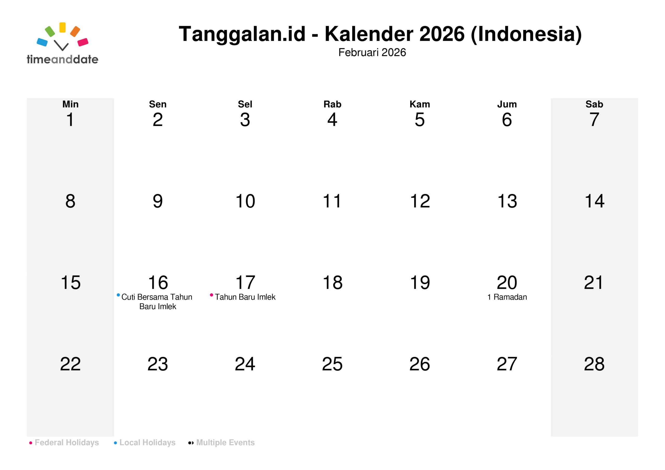 Kalender Februari 2026 ini berisi daftar lengkap hari libur nasional dan cuti bersama. Simak tanggal merah Februari 2026 untuk perencanaan kerja, sekolah, dan liburan keluarga.