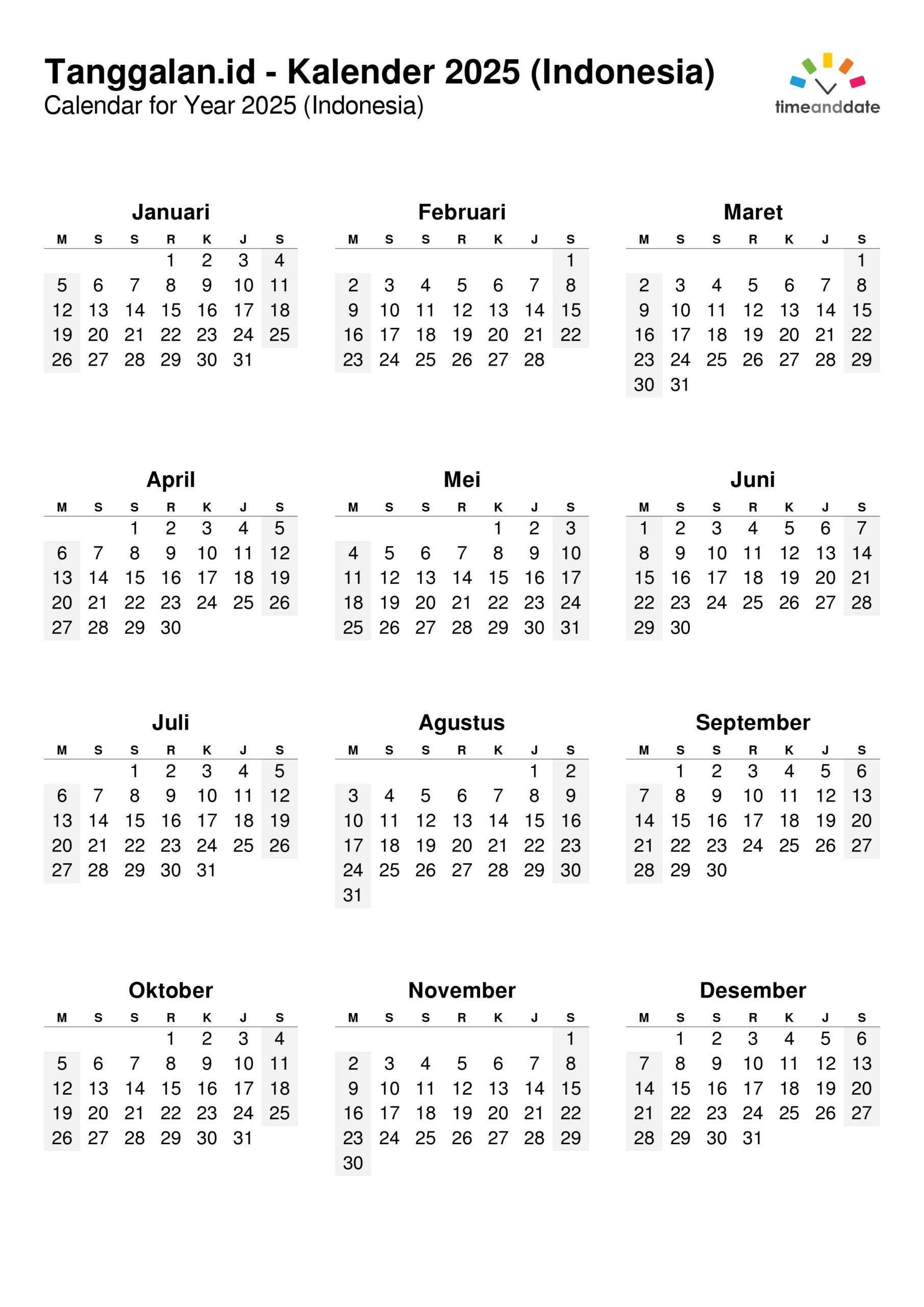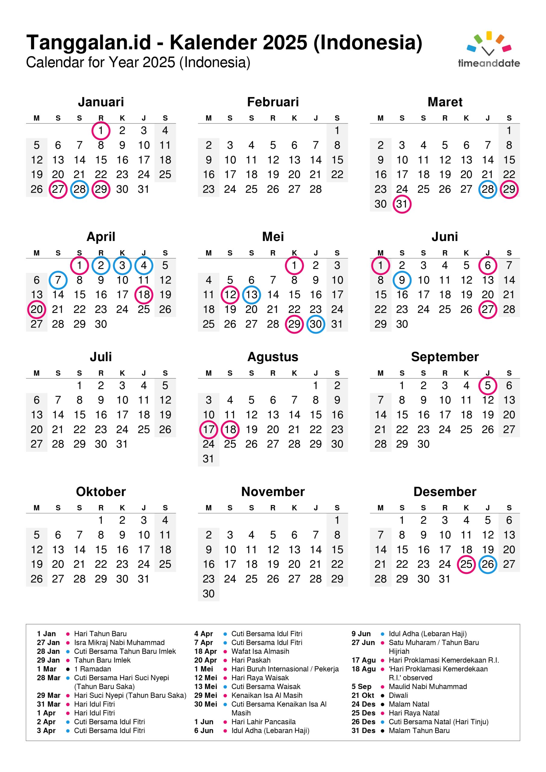 Kalender 2025 Indonesia berisi daftar lengkap hari libur nasional dan cuti bersama berdasarkan keputusan pemerintah. Simak tanggal merah tahun 2025 Masehi (2025 M) untuk perencanaan kerja, sekolah, dan liburan keluarga.