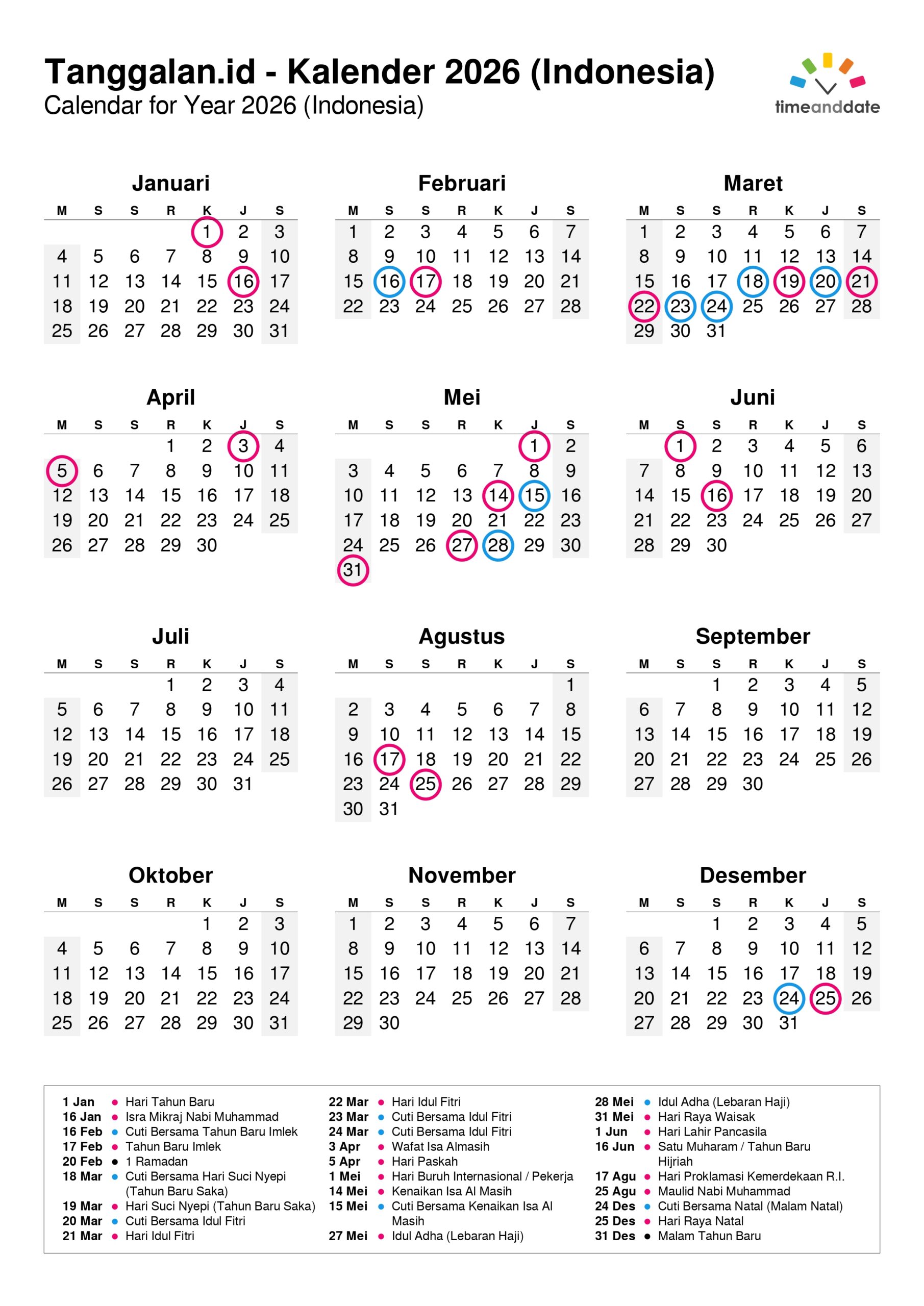 Kalender 2026 Indonesia berisi daftar lengkap hari libur nasional dan cuti bersama berdasarkan keputusan pemerintah. Simak tanggal merah tahun 2026 Masehi (2026 M) untuk perencanaan kerja, sekolah, dan liburan keluarga.