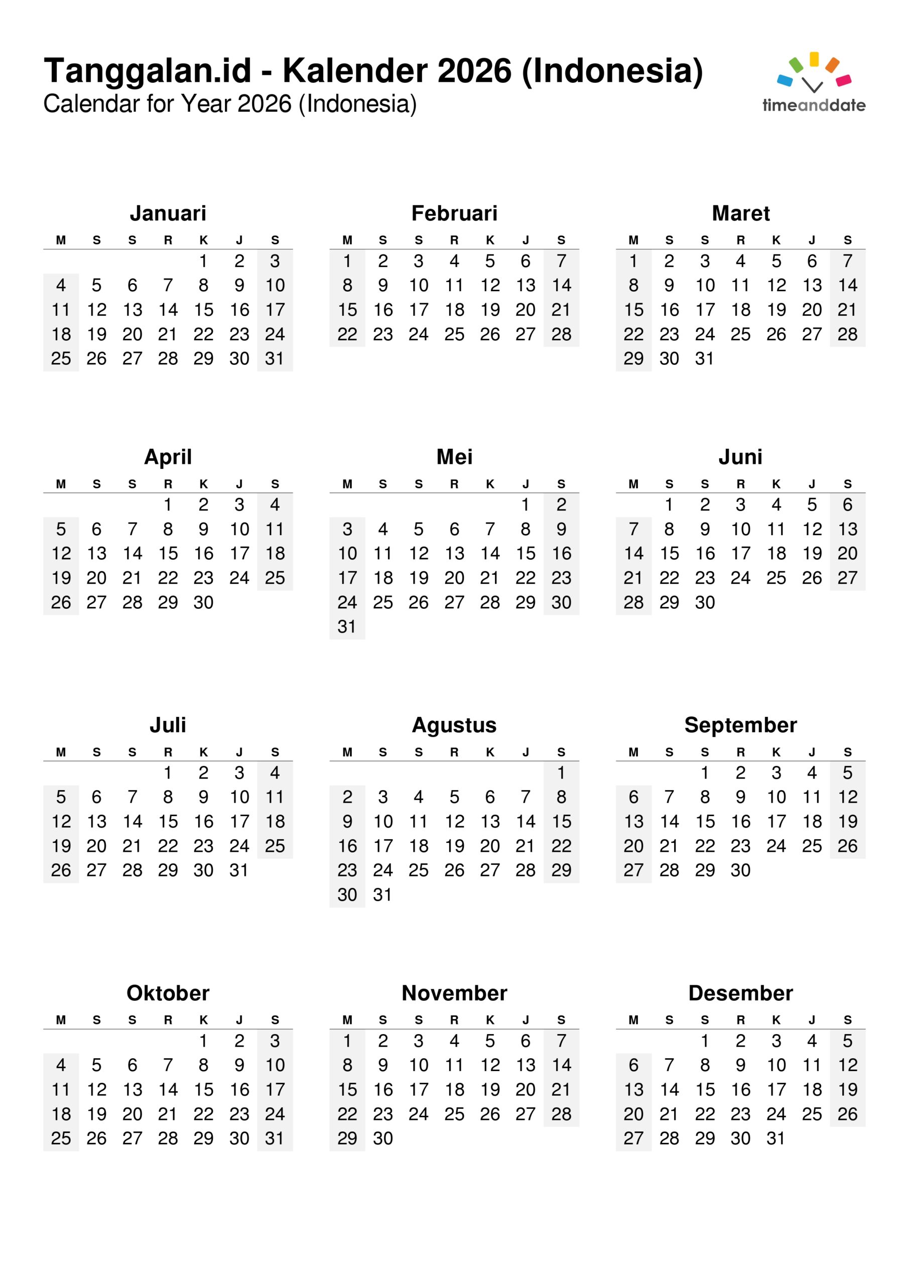 Kalender 2026 ini lengkap dengan tanggal merah dan daftar hari libur nasional Indonesia, cuti bersama, serta kalender Jawa dan Hijriyah.