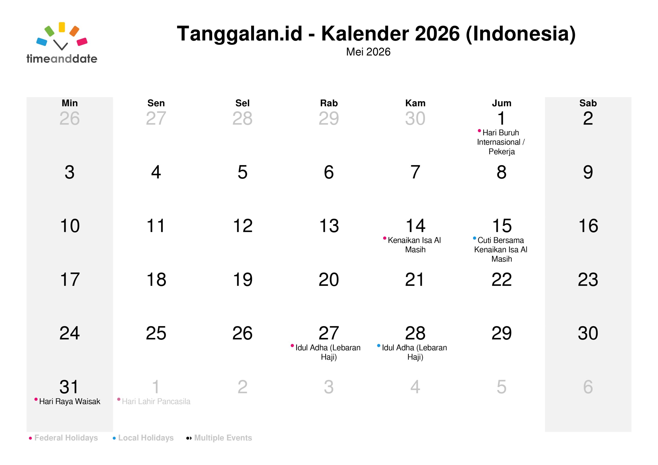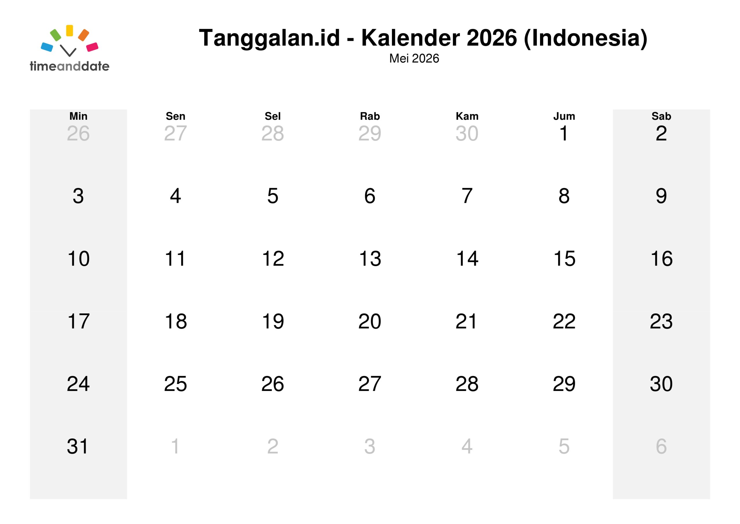 Kalender Mei 2026 terdiri dari 31 hari dan termasuk salah satu bulan dengan jumlah hari libur nasional paling banyak di Indonesia.