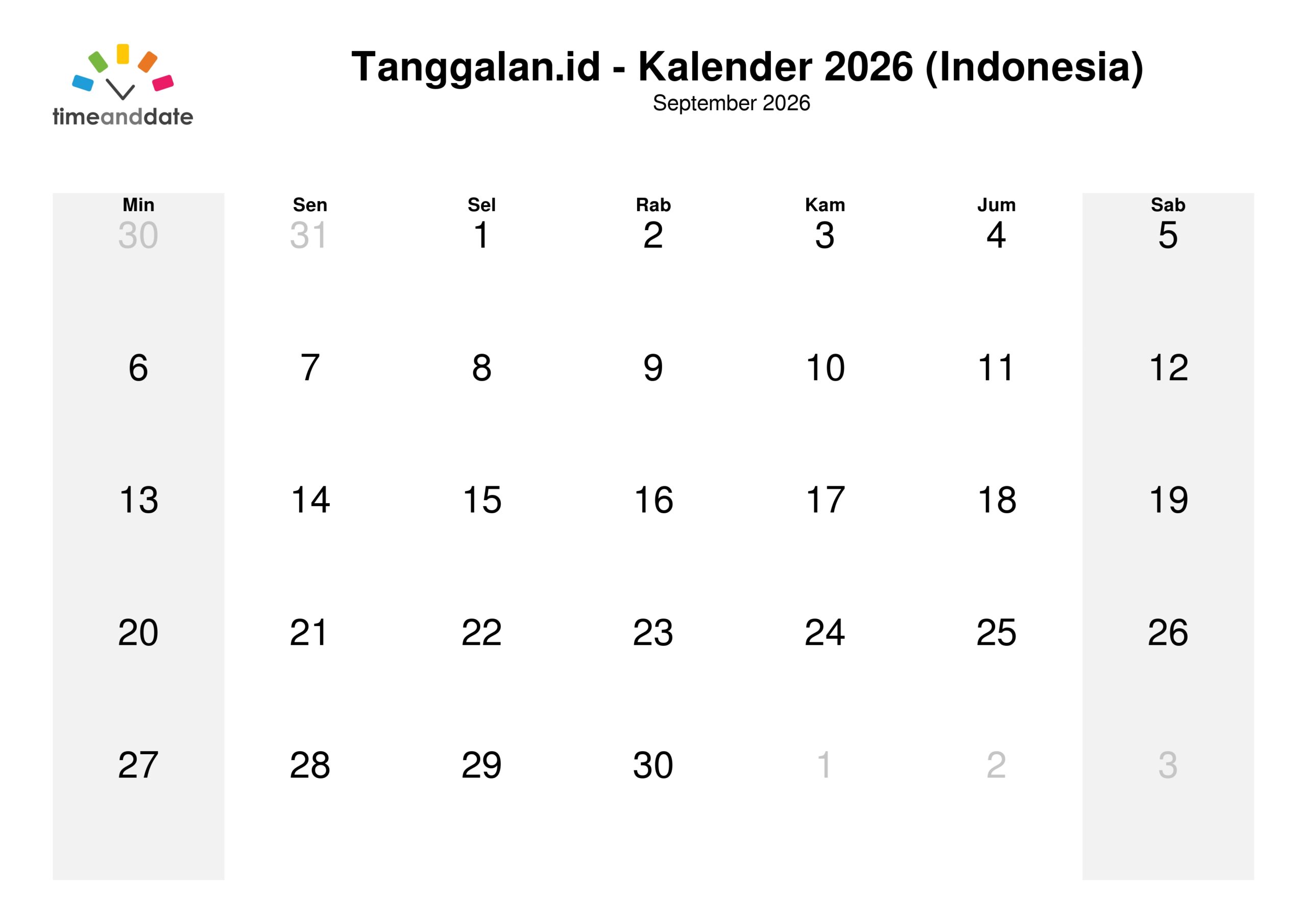 Berdasarkan Surat Keputusan Bersama (SKB) 3 Menteri tentang Hari Libur Nasional, tidak terdapat hari libur nasional pada bulan September 2026.
